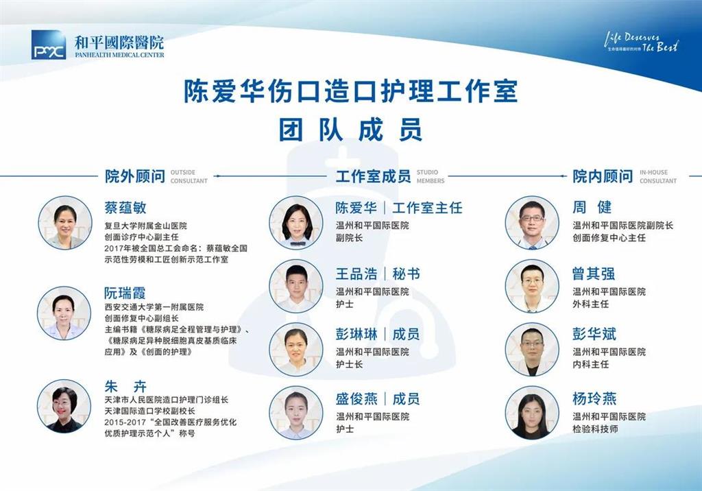 和平國際醫(yī)院陳愛華傷口造口護理工作室是浙江省首家傷口造口護理工作室。該工作室遵循醫(yī)院患者和服務對象至上的服務理念,倡導用細心撫平“傷口”,用愛心呵護“玫瑰”的服務品質(zhì)與追求,該工作室在傷口造口護理人才培養(yǎng)、學科建設(shè)、專業(yè)發(fā)展等方面不斷發(fā)展,著力打造成為溫州市及浙南地區(qū)傷口造口診療護理一體化服務中心,成為省內(nèi)外傷口造口人才培養(yǎng)重要基地。