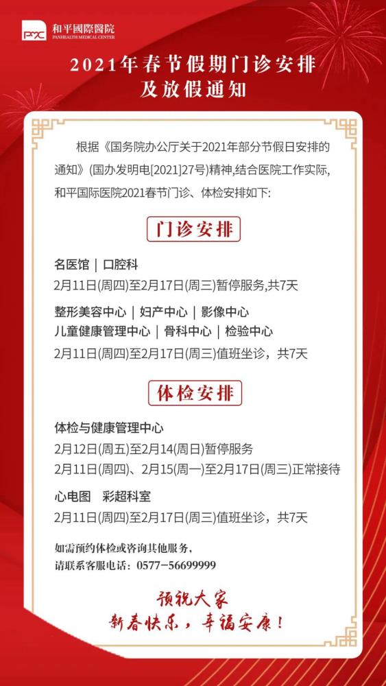 和平國際醫(yī)院2021年春節(jié)假期門診安排及放假通知