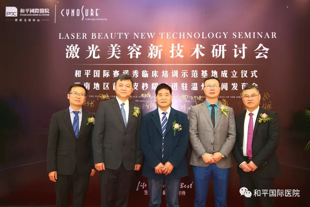 (從左至右)此圖為賽諾秀中國(guó)華東地區(qū)經(jīng)理劉永強(qiáng),中國(guó)知名美膚權(quán)威專家喬剛,中國(guó)激光美膚之王陳錦安,和平國(guó)際醫(yī)院院長(zhǎng)薛志輝,和平國(guó)際皮膚美容中心主任吳慧明