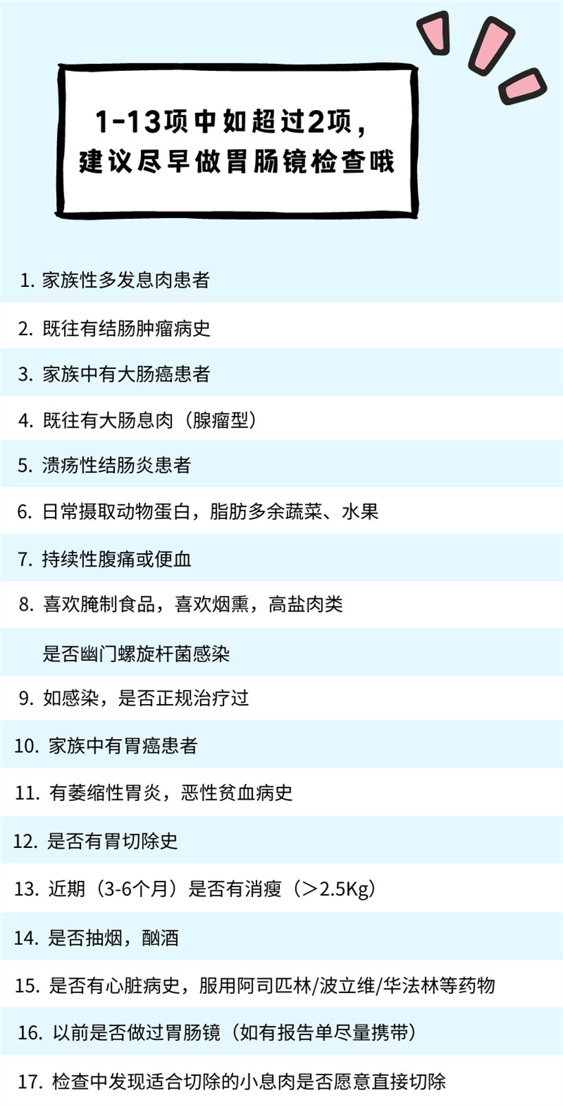 下面這個(gè)自查項(xiàng)目大家可以根據(jù)自身情況來(lái)初步判斷哦,不過(guò)最終是否適合做無(wú)痛胃腸鏡,還需要醫(yī)生親自做評(píng)估。