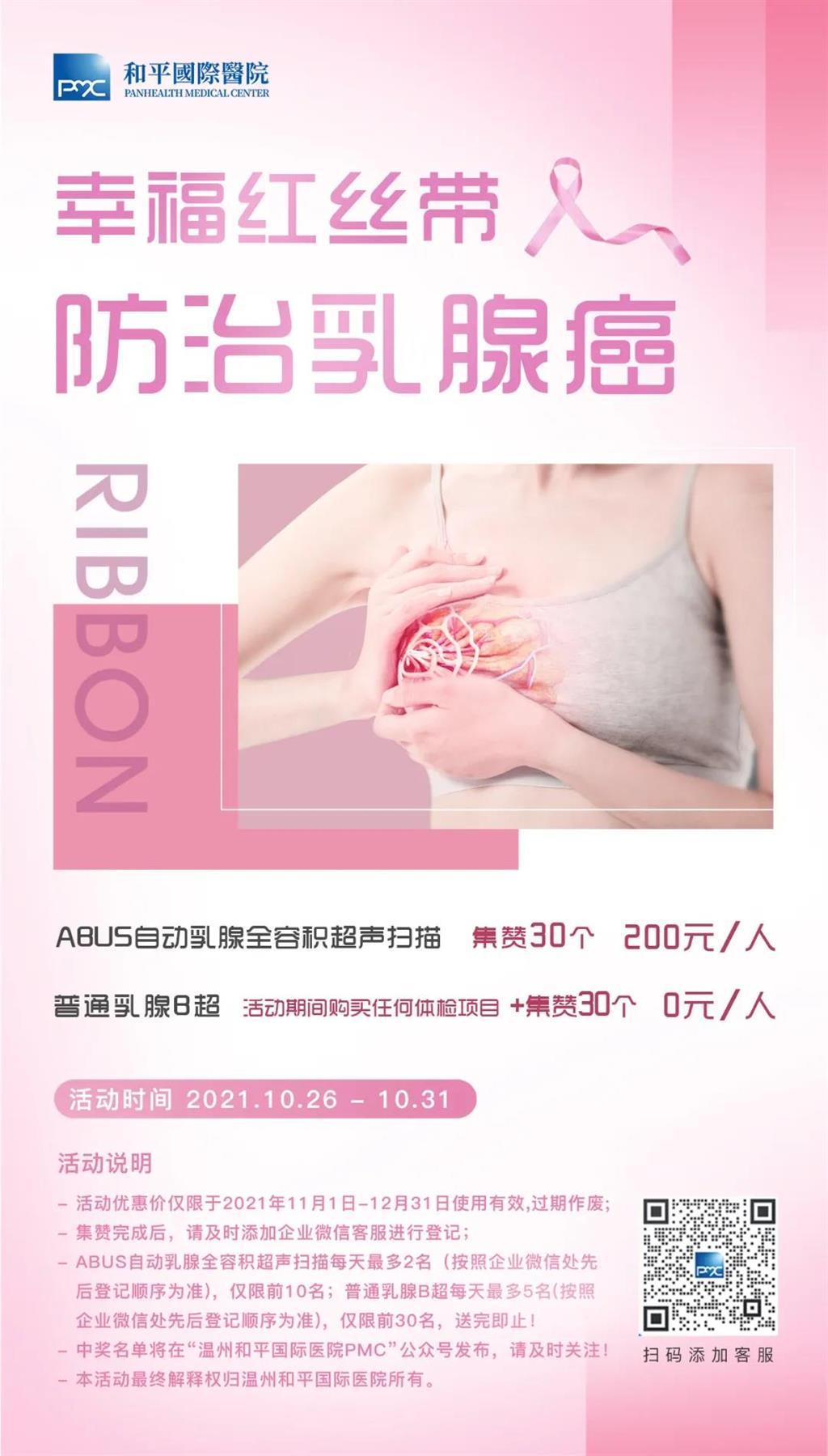 借著每年10月被定為“乳腺癌防治月”的契機(jī),溫州和平國際醫(yī)院發(fā)起“幸福紅絲帶,防治乳腺癌”活動,免費(fèi)贈送“普通乳腺B超”項(xiàng)目和超優(yōu)惠價(jià)享受“ABUS自動乳腺全容積超聲掃描”項(xiàng)目,活動規(guī)則如下: