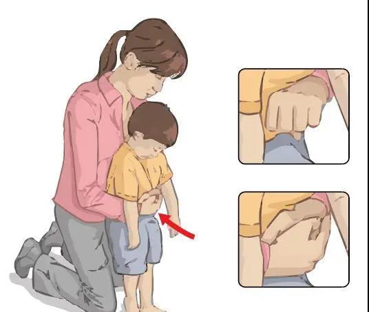 可采用上述用于成人4個(gè)步驟的②③④三點(diǎn),或稍稍彎下腰去,靠在一固定的水平物體上(如桌子邊緣、椅背、扶手欄桿等),以物體邊緣壓迫上腹部,快速向上沖擊。重復(fù)之,直至異物排出。
