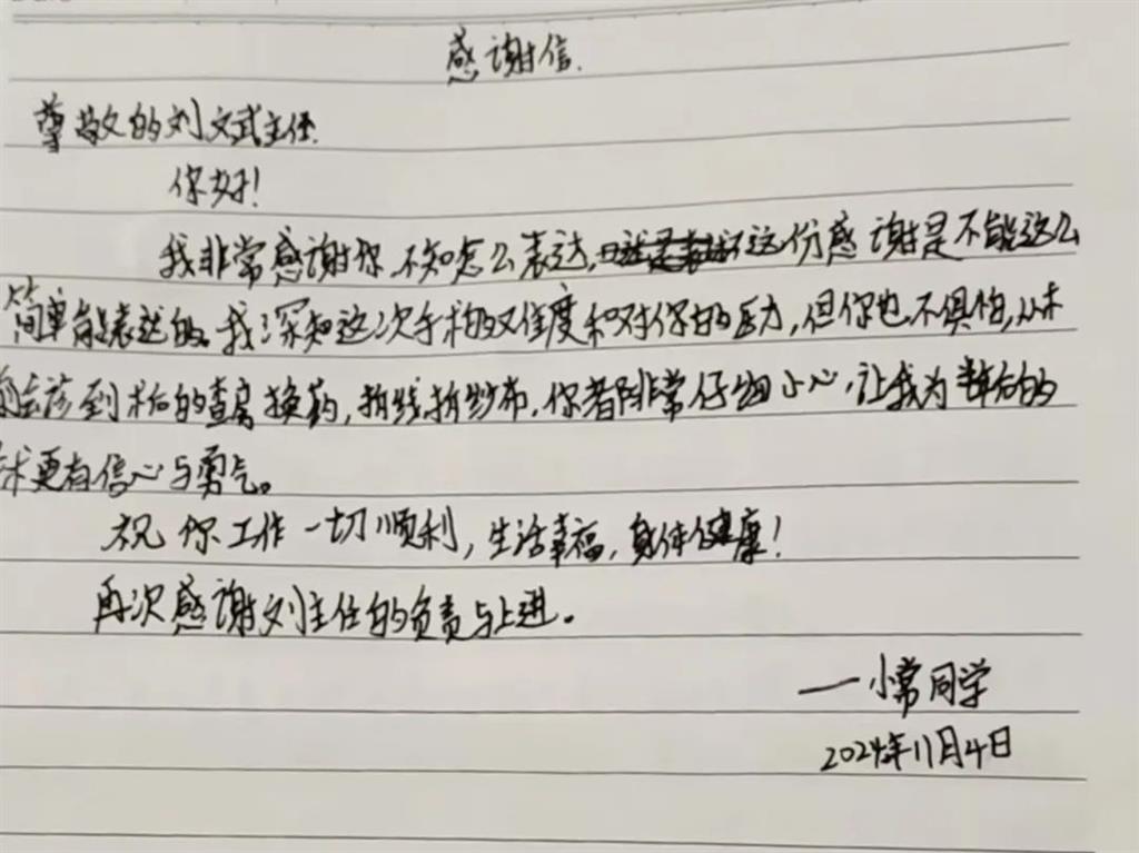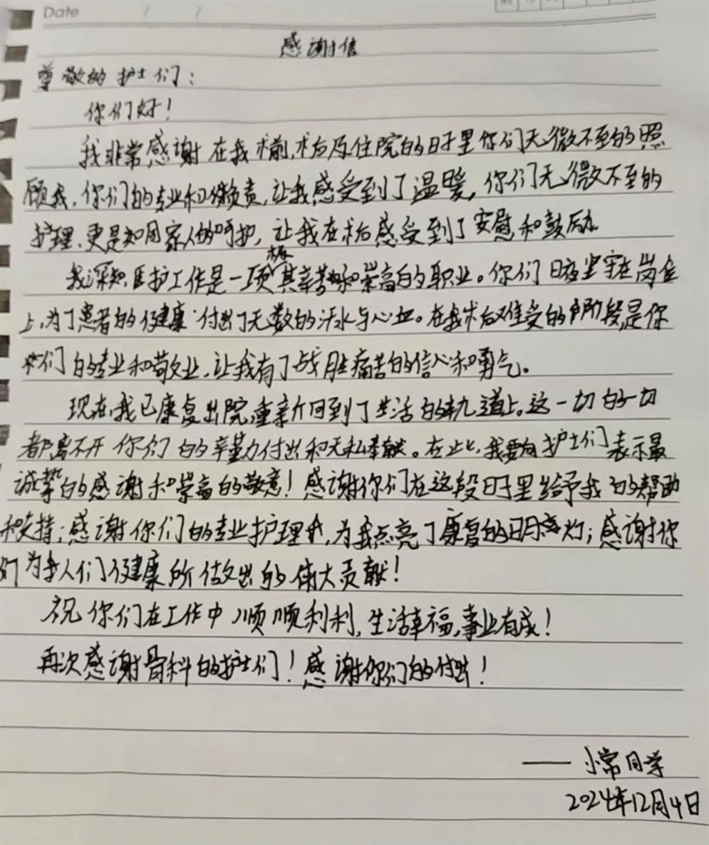 “是你們的專業(yè)和敬業(yè),讓我有了戰(zhàn)勝痛苦的勇氣和信心。”12月4日,經(jīng)過18天的術后治療與觀察,MDT專家團隊多方面評估,初晨術后恢復良好,可以出院。出院時,初晨親筆寫下兩封感謝信,交給了醫(yī)院整形外科主任劉斌和創(chuàng)傷與創(chuàng)面修復科的護士們。紙短情長,字里行間流露的真情打動了每一個人。