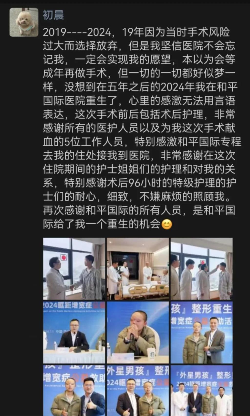 早晨,當明媚的陽光灑進和平國際醫(yī)院12樓病房,16歲的“外星男孩”初晨在微信朋友圈上寫下:趟過灘涂上大道,越過山地等高峰。在和平國際醫(yī)院“重生”后,我終于登上了屬于自己人生的珠穆朗瑪峰。