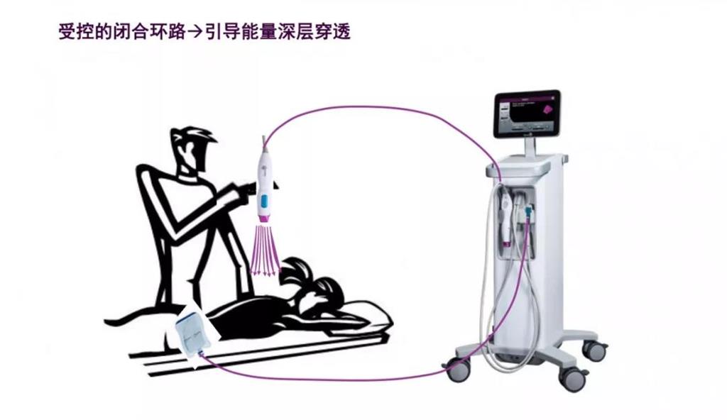 探頭通過皮膚表層傳導(dǎo)能量,穿透深度不僅能達到真皮層,還可以延伸至纖維間隔,既可以除皺,還能達到緊致提拉的效果