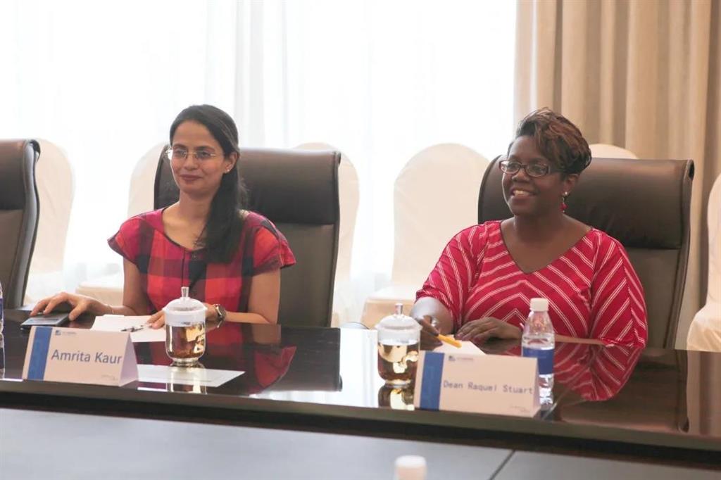 來訪代表為溫州肯恩大學(xué)人文學(xué)院院長Dean Raquel Stuart(下圖左三)、心理學(xué)教授Amrita Kaur(下圖左二)、院長助理項(xiàng)冰靈Evangeline(下圖左一)。