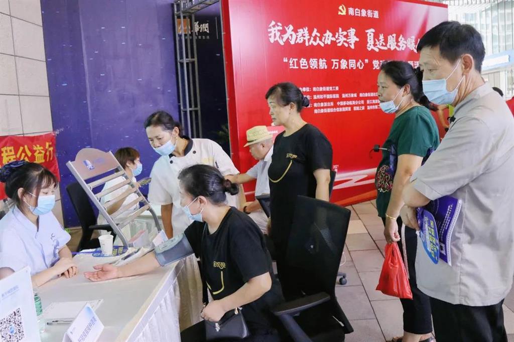 7月30日下午兩點(diǎn)半,在淅淅瀝瀝的小雨聲中,和平國際醫(yī)院“紅悅工程”攜手南白象街道黨工委、溫州萬象城、南白象街道社區(qū)衛(wèi)生服務(wù)中心、南白象街道黨群服務(wù)中心,來到溫州華潤萬象城,為商場顧客、員工帶來了新冠疫苗接種咨詢、健康咨詢、量血壓、測血糖等義診服務(wù)。