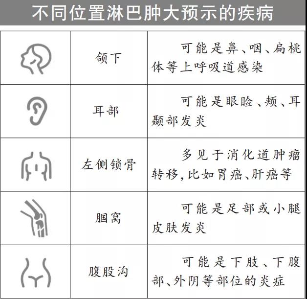 從腫大的部位來看,頜下、耳周、頸部、鎖骨、腹股溝(大腿根兒)、腘窩處的淋巴腫大,既有可能是炎癥,也可能是腫瘤。