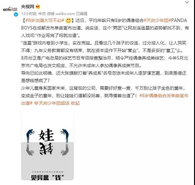 內(nèi)容對平均年齡只有8歲的偶像組合,#天府少年團(tuán)#PANDA BOYS(后更名為“熊貓少兒藝術(shù)團(tuán) Panda Boys”)出道一事進(jìn)行點名批評。一句“別讓金色的童年,變成金子的童年”發(fā)人深省,在娛樂亂象頻出的當(dāng)代,“偶像”低齡化內(nèi)卷問題越來越嚴(yán)重,錯誤的價值觀誤導(dǎo)著一批又一批辨別能力較弱的青少年。“偶像”不應(yīng)該成為一種盈利、創(chuàng)收的手段,它應(yīng)該代表的是一種“精神”,是正向價值觀的體現(xiàn),是能夠鼓舞人心,不斷提升自己的榜樣。